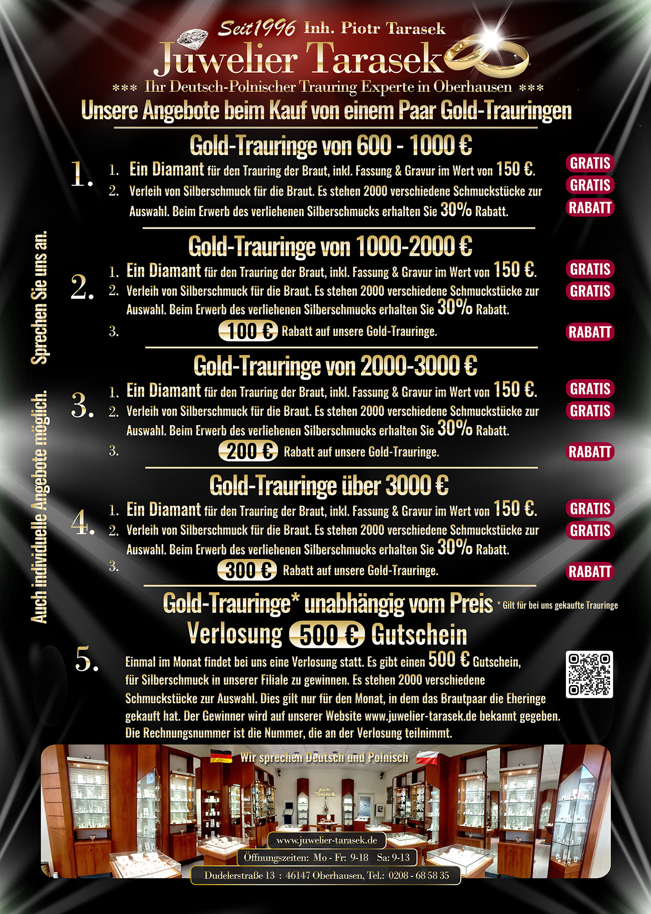 Einmal im Monat findet bei uns eine Verlosung statt. Es gibt einen 500 € Gutschein, für Silberschmuck in unserer Filiale zu gewinnen. Es stehen 2000 verschiedene Schmuckstücke zur Auswahl. Dies gilt nur für den Monat, in dem das Brautpaar die Eheringe gekauft hat. Der Gewinner wird auf unserer Website www.juwelier-tarasek.de bekannt gegeben. Die Rechnungsnummer ist die Nummer, die an der Verlosung teilnimmt.